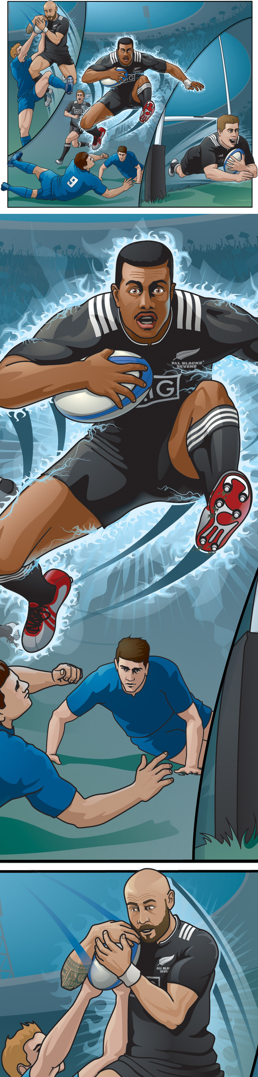 This job was a bit of fun, with some great results, I was asked to create a series of comic styled illustrations for the Wellington 7's to capture the likeness of some of the players, and importantly the atmosphere of the event, these needed to have plenty of flexibility for final use as they where to be used on TVC's, Billboards, busses, online etc. So again illustrator was the perfect tool for the job. This was the first of three - the on field action.