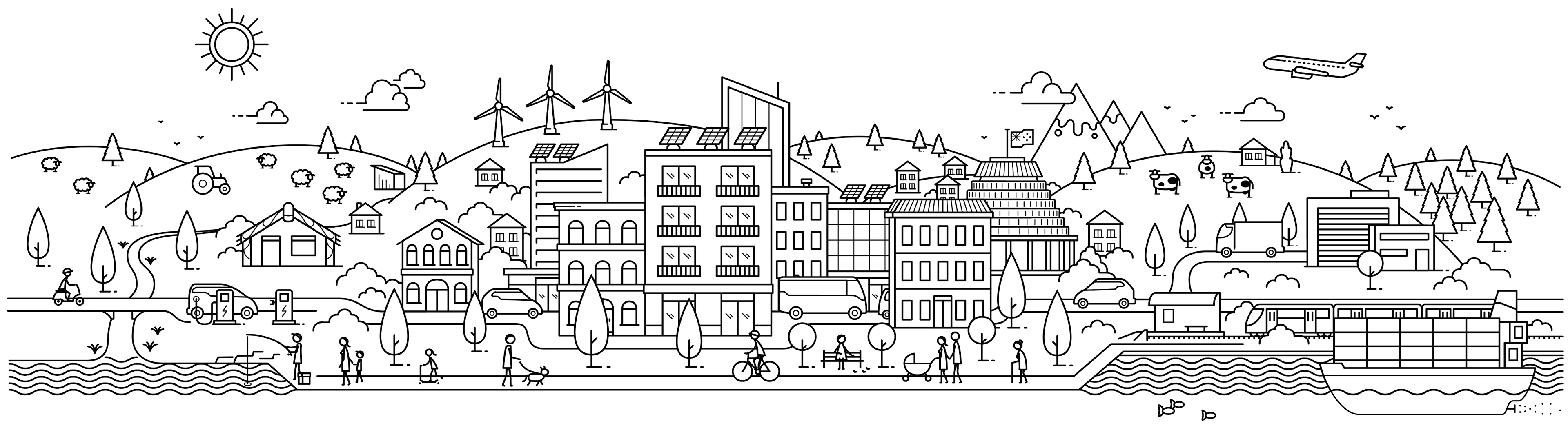 This commission was to create a clean, modern line out illustration, that covers urban to country environments, & includes the key elements the climate change commission is involved in, elements that could also be used as spot art throughout the document.