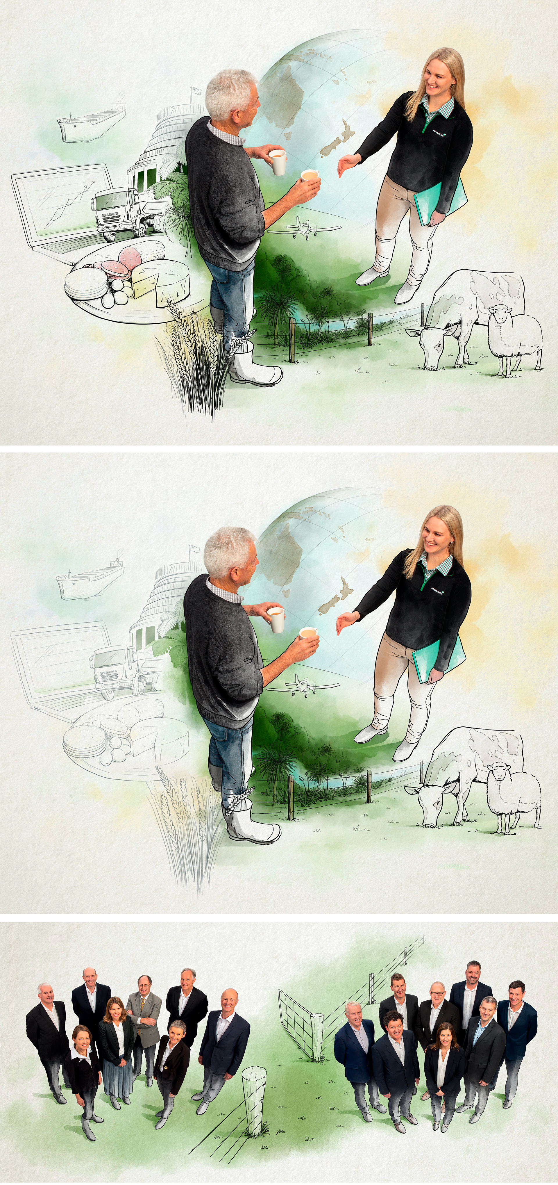 I was commissioned to develop these illustrations using photographic elements, hand drawn line and watercolour styled artwork, to create engaging illustrations for a a variety of uses.