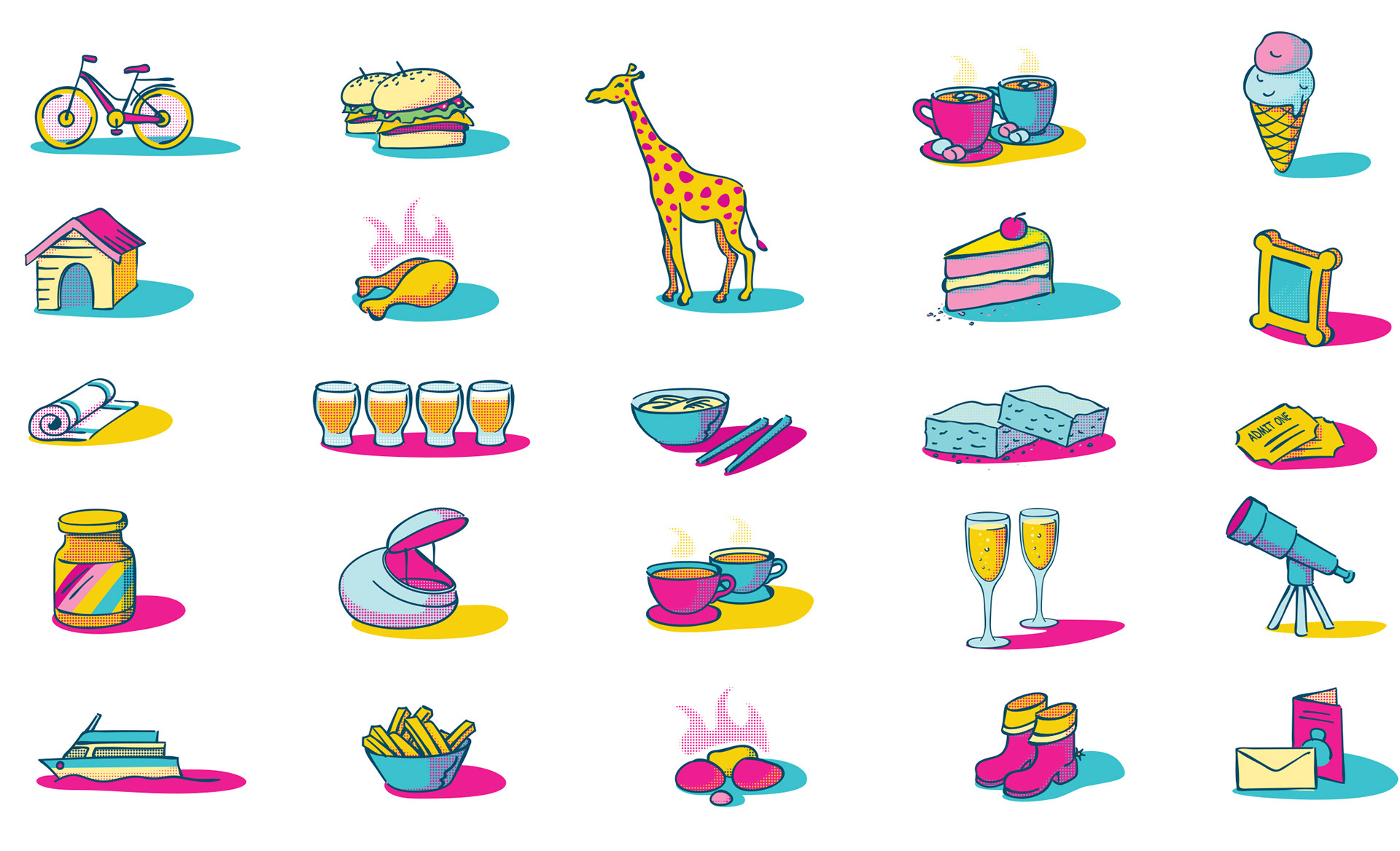 For this piece I was commissioned by WREDA to come up with a fun, exciting, & engaging illustration that conveyed a sense of discovery within Wellington city, for use as an online advent calendar (and print around the city) this was to promote retailers and activity within the city. The online advent calendar was animated, with elements within the artwork moving, & hidden windows opening to reveal daily offers (Icons below). I was initially keen on using a limited colour pallet, as this offers a sense of sophistication, and balance in such a busy image, after some exploration we settled on the final palette (incorporating elements of the WREDA brand palette).... fits the brief nicely.